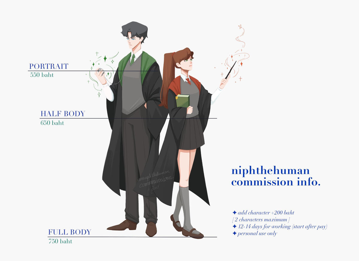 commercial use : คืองานที่ใช้แสดงผลกำไรทั้งทางตรง (ผลิตเป็นสินค้า มีการค้าขาย) และทางอ้อม (โปรโมท, โฆษณา)✸ ทุกผลงานเป็นสิขสิทธิ์ของ niphthehuman✸ ไม่อนุญาตให้นำไปใช้ต่อยอดในงานอื่น ขายต่อ ดัดแปลง แก้ไข หากไม่ได้ตกลงกันตั้งแต่แรกค่ะ✸ ทุกผลงานผู้วาดสามารถโพสต์ลง SNS ได้ ถ้าไม่ต้องการให้ผู้วาดโพสต์ลงโซเชี่ยลของผู้วาด สามารถแจ้งได้ค่ะ✸ กรณีผู้จ้างขอยกเลิกหลังเริ่มงานแล้วจะไม่คืนมัดจำค่ะ✸ ระยะเวลาทำงาน 3 วันต่อชิ้น ถ้าถึงคิวเริ่มแล้วเราจะแจ้งก่อนเริ่มค่ะ
